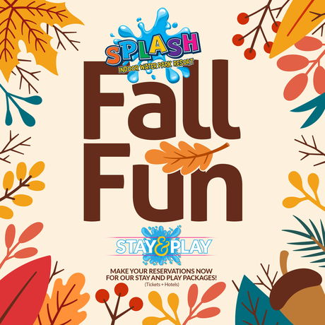 SPLASH Into Fall Fun at SPLASH Indoor Water Park! Package available Friday and Saturday nights beginning September 26 through October 25, 2025 and again November 14 through November 22, 2025. Stay one or more nights for Fall fun! Package includes overnight hotel accommodations, up to 4 tickets to SPLASH Indoor Water Park the day of arrival and departure, FALL FUN themed children's activities, 2 - $5 arcade tickets, $5 SPLASH food and beverage coupon and a $5 SPLASH gift shop coupon. Full breakfast at the hotel each morning.