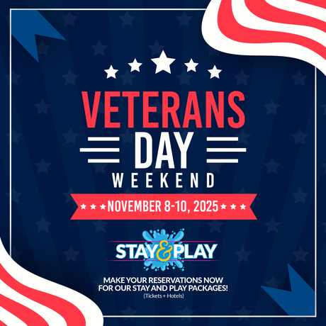 Celebrate Veteran's Day Weekend at SPLASH Indoor Water Park! Package available Friday through Monday, November 7 through 10, 2025.Stay one or more nights for patriotic fun! Package includes overnight hotel accommodations, up to 4 tickets to SPLASH Indoor Water Park the day of arrival and departure, Veteran's Day themed activities, 2 - $5 arcade tickets, a $5 SPLASH food and beverage coupon, and a $5 SPLASH gift shop coupon. Full breakfast at the hotel each morning.