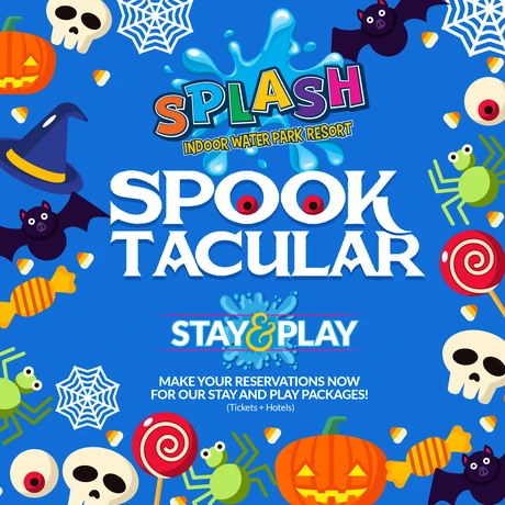 Kick off Halloween weekend with SPLASH SPOOKTACULAR at Splash Indoor Water Park! Package available Friday and Saturday, October 31 & November 1, 2025. Stay one or more nights for Halloween fun! Package includes overnight hotel accommodations, up to 4 tickets to SPLASH Indoor Water Park the day of arrival and departure, HALLOWEEN themed activities including Pumpkin Palooza and many autumn antics, 2 - $5 arcade tickets, a $5 SPLASH food and beverage coupon, and a $5 SPLASH gift shop coupon. Full breakfast at the hotel each morning.