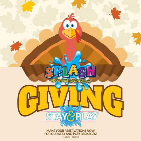 Celebrate SPLASHGiving weekend at SPLASH Indoor Water Park! Package available Friday and Saturday, November 28 & 29, 2025. Stay one or more nights for Thanksgiving fun! Package includes overnight hotel accommodations, up to 4 tickets to SPLASH Indoor Water Park the day of arrival and departure, THANKSGIVING themed activities, 2 - $5 arcade tickets, a $5 SPLASH food and beverage coupon, and a $5 SPLASH gift shop coupon. Full breakfast at the hotel each morning.